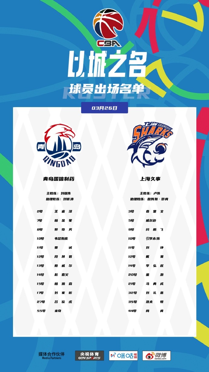 3月26日訊 今晚7點(diǎn)35分,青島男籃將在主場迎戰(zhàn)上海男籃。