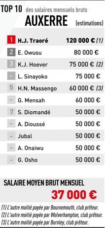因此,歐塞爾俱樂部(AJA)雖然僅需承擔(dān)以下租借球員月薪的一半:由伯恩茅斯租借的科特迪瓦進(jìn)攻中場(chǎng)哈梅德·朱尼爾·特拉奧雷(25歲,歐賽爾承擔(dān)24萬歐元中的12萬)、由狼隊(duì)租借的荷蘭右后衛(wèi)基-加納·霍福爾(23歲,歐賽爾承擔(dān)15萬歐元中的7.5萬),以及由伯恩利租借的中場(chǎng)漢-諾阿·馬森戈(23歲,歐賽爾承擔(dān)12萬歐元中的6萬),馬森戈是合同中唯一包含買斷選項(xiàng)的球員,這個(gè)價(jià)格也使得這三位球員分別位列俱樂部薪資榜的第一、第三和第五位。