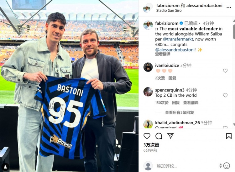 - 羅馬諾社媒曬與巴斯托尼合影:8000萬歐,世界身價并列最高后衛(wèi)