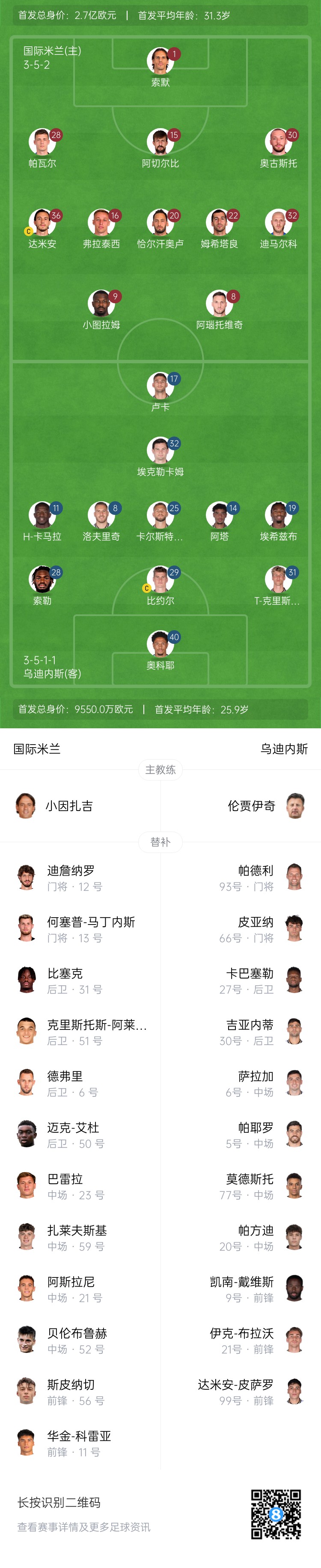 - 國米vs烏迪內(nèi)斯首發(fā):小圖拉姆、阿瑙先發(fā),姆希塔良、恰20出戰(zhàn)