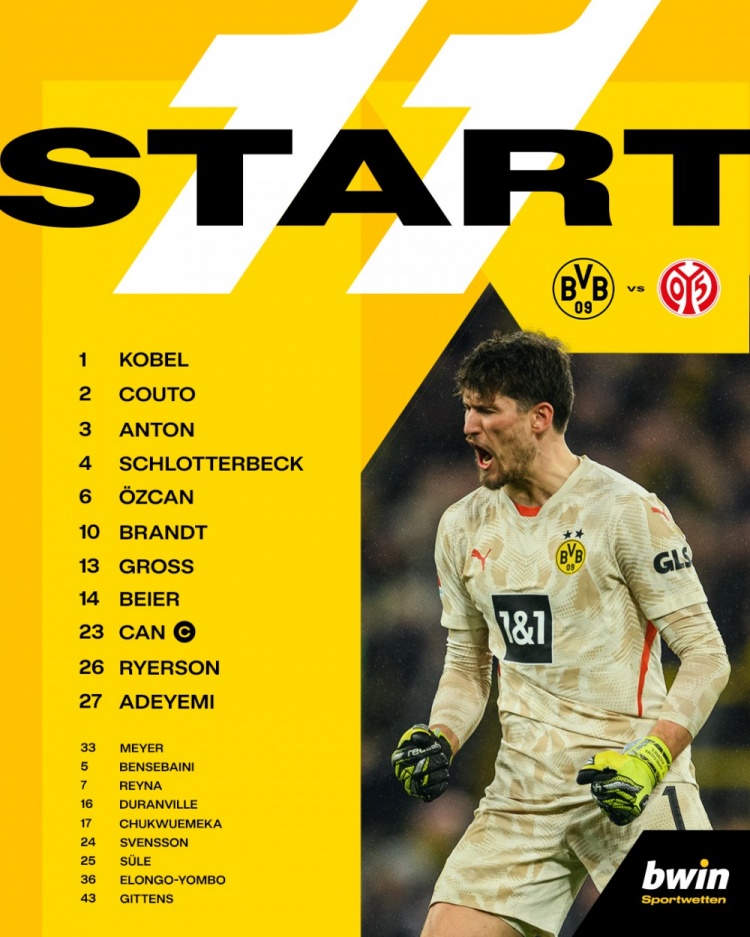 多特vs美因茨首發(fā):阿德耶米、拜爾搭檔前鋒,布蘭特首發(fā)