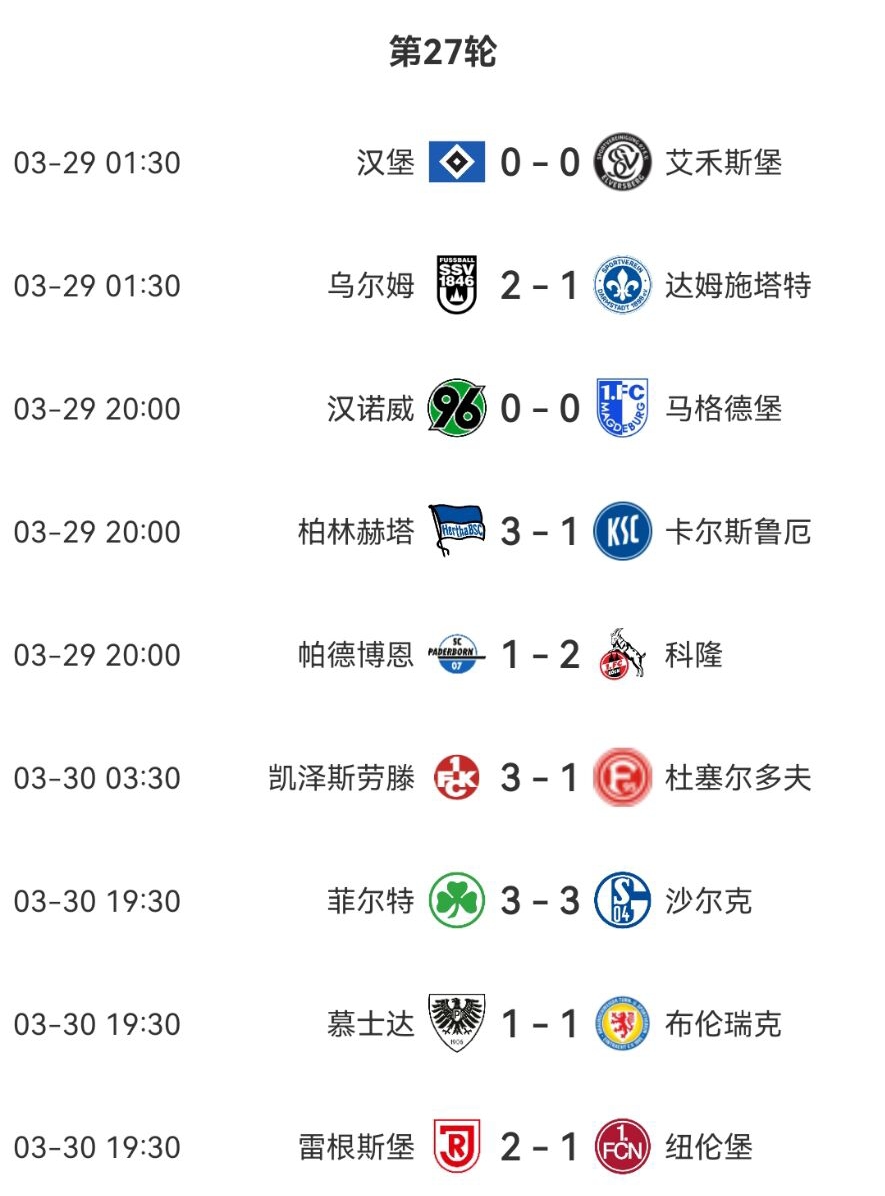 03月30日訊 德乙結(jié)束第27輪比賽,本輪積分榜前中段多支球隊(duì)丟分,原本榜首的漢堡戰(zhàn)平積分被科隆反超,k神執(zhí)教的紐倫堡不敵副班長雷根斯堡,錯(cuò)失了寶貴的追分機(jī)會(huì)。