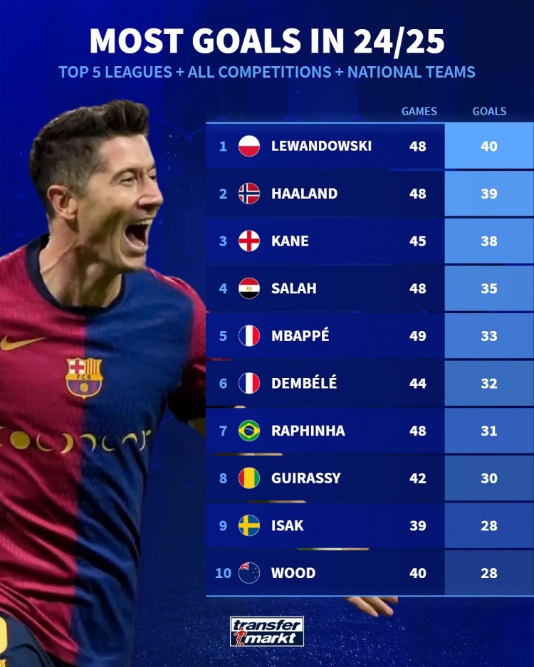 本賽季五大聯(lián)賽球員進(jìn)球榜:36歲萊萬(wàn)40球居首,哈蘭德、凱恩前三