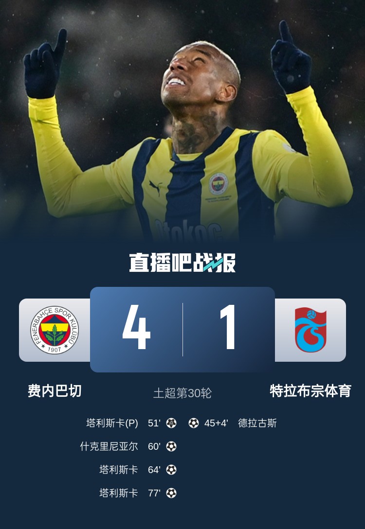 費(fèi)內(nèi)巴切本輪4-1擊敗特拉布宗體育,塔利斯卡戴帽,費(fèi)內(nèi)巴切距榜首3分。