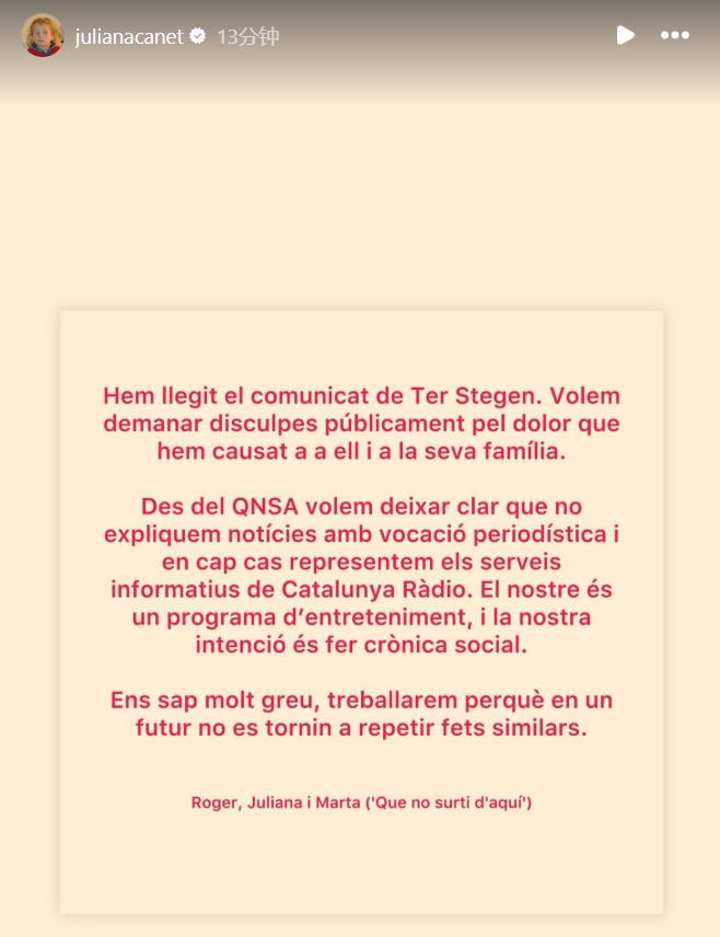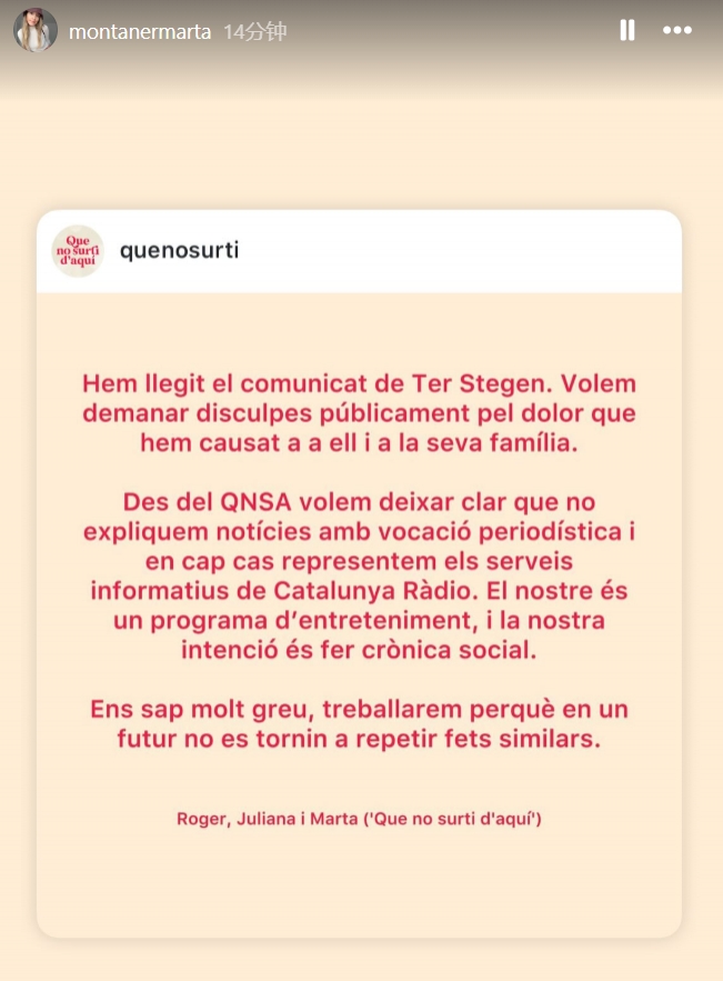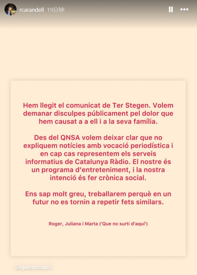 從節(jié)目《Que no surti d’aquí》的角度,我們想明確表示,我們并非以新聞視角報道事件,也不代表加泰羅尼亞廣播電臺的新聞服務。我們的節(jié)目是娛樂性質(zhì)的,我們的目的是進行社會紀實。