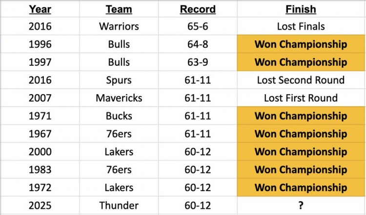 - 雷霆賽季前72場拿到60勝 歷史第11支 前面10支最終7隊奪冠