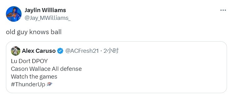 杰林-威廉姆斯對此也十分認(rèn)同,他轉(zhuǎn)發(fā)了卡魯索的這條動態(tài),并在旁邊寫道:“老將懂球。”