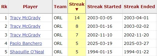 而魔術整個隊史上,而僅麥迪、奧尼爾和班凱羅三人能連續(xù)5場30+。