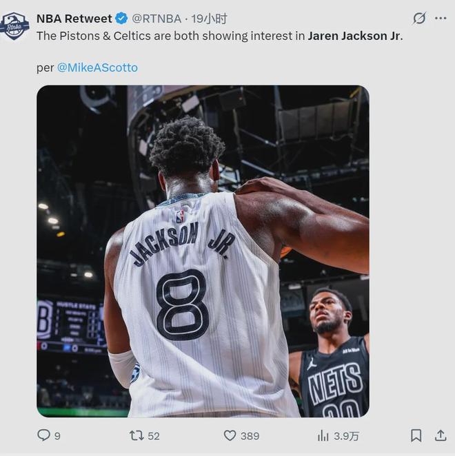 據(jù)NBA名記Michael Scotto報(bào)道,活塞和凱爾特人有意灰熊內(nèi)線(xiàn)小賈倫·杰克遜。目前灰熊只把莫蘭特?cái)[上貨架,還沒(méi)決定是否交易3J。就在本周,詹姆斯經(jīng)紀(jì)人里奇-保羅公開(kāi)提議,湖人應(yīng)該用里夫斯換3J。你沒(méi)看錯(cuò),3J這么搶手!