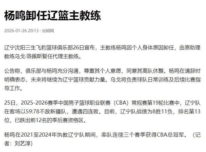1月26日,遼寧隊在結(jié)束對戰(zhàn)新疆隊的比賽后,楊鳴宣布了辭去遼寧隊主帥一職。