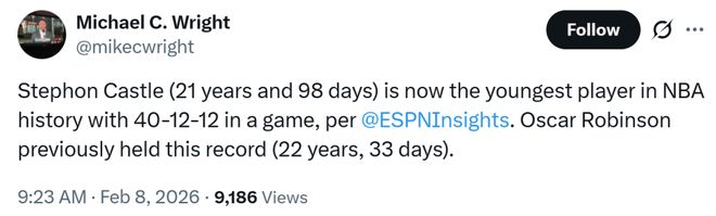 也成為NBA歷史上砍下40+三雙第三年輕的球員,僅次于詹姆斯和東契奇。