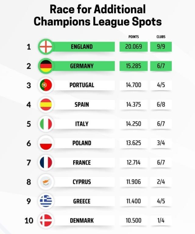 歐冠聯(lián)賽階段賽場結(jié)束,以下為本賽季目前各聯(lián)賽歐戰(zhàn)系數(shù)(前2名獲額外歐冠名額):