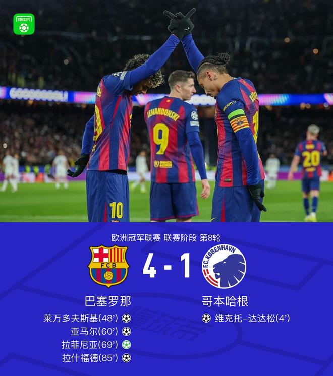 北京時(shí)間1月29日歐洲冠軍聯(lián)賽 聯(lián)賽階段 第8輪,巴塞羅那對(duì)陣哥本哈根。上半場(chǎng),達(dá)達(dá)松單刀破門(mén)。下半場(chǎng),亞馬爾助攻,萊萬(wàn)破門(mén)。隨后,亞馬爾射門(mén)折射入網(wǎng)。萊萬(wàn)造點(diǎn),拉菲尼亞主罰命中,替補(bǔ)登場(chǎng)的拉什福德任意球直接得分。全場(chǎng)比賽結(jié)束,巴薩4-1逆轉(zhuǎn)哥本哈根直接晉級(jí)。