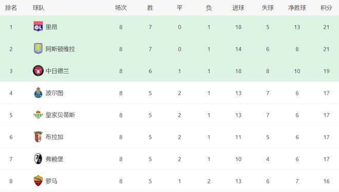 至此,歐聯(lián)杯16強(qiáng)已經(jīng)決出8個(gè)名額,排名前8的球隊(duì)直接晉級(jí),包括:里昂、阿斯頓維拉、中日德蘭、波爾圖、皇家貝蒂斯、布拉加、弗賴堡和羅馬。