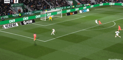 第45+2分鐘,費蘭-托雷斯單刀過門將打門,皮球被對方解圍