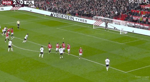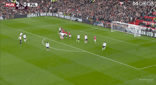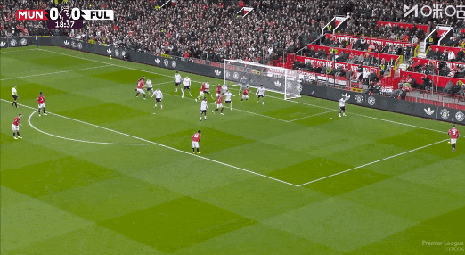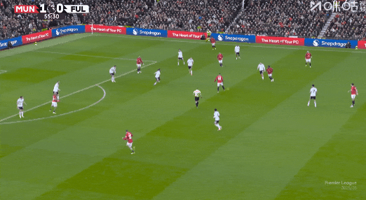 第19分鐘,B費助攻,卡塞米羅后點泰山壓頂頭槌破門,曼聯(lián)1比0富勒姆!