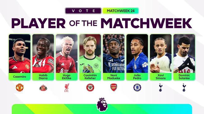 北京時間2月3日,英超官方公布了第24輪比賽的最佳球員候選名單,其中卡塞米羅、?;倏?、馬杜埃凱、若昂-佩德羅、哈維-西蒙斯、索蘭克等球員在列。