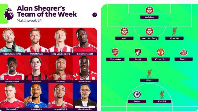 北京時間2月4日凌晨,英超官方曬出了阿蘭-希勒評選的英超第24輪最佳陣容,其中,科納特、馬杜埃凱、維爾茨、卡塞米羅、若昂-佩德羅和?;倏说热嗽诹?。