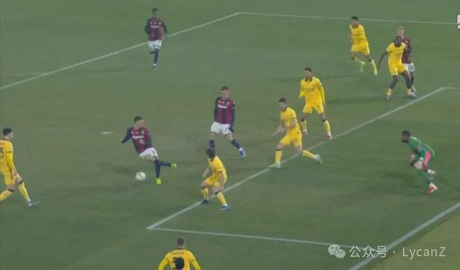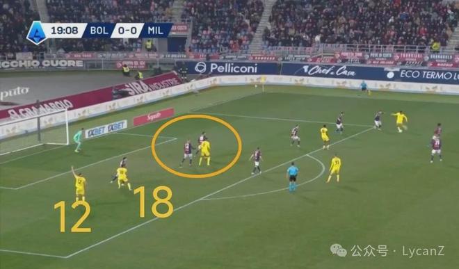 10′10″,博洛尼亞逼搶前場(chǎng)完成斷球,直接形成4V4面對(duì)米蘭后衛(wèi),在弧頂機(jī)會(huì)和下底選擇中,羅維選擇自己?jiǎn)胃桑蝗虢麉^(qū)也晃開了加比亞重心,受到推搡但沒有吹罰。