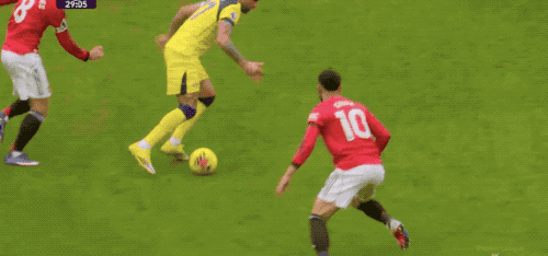 第23分鐘,阿瑪?shù)碌蟻喡逦?名防守球員后傳球,B費(fèi)順勢(shì)掃射,將球打偏。