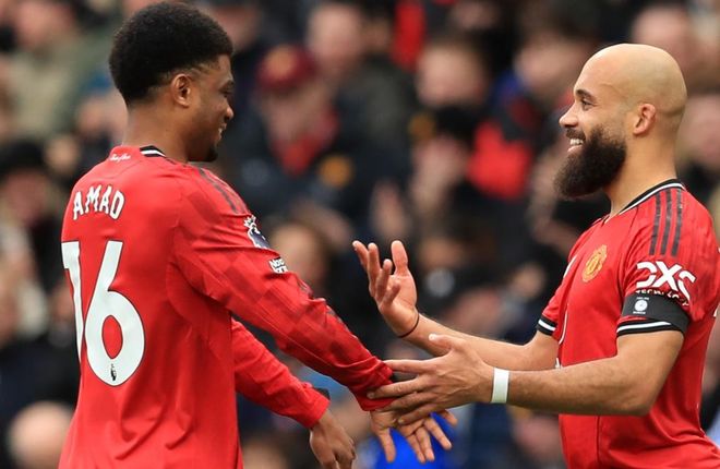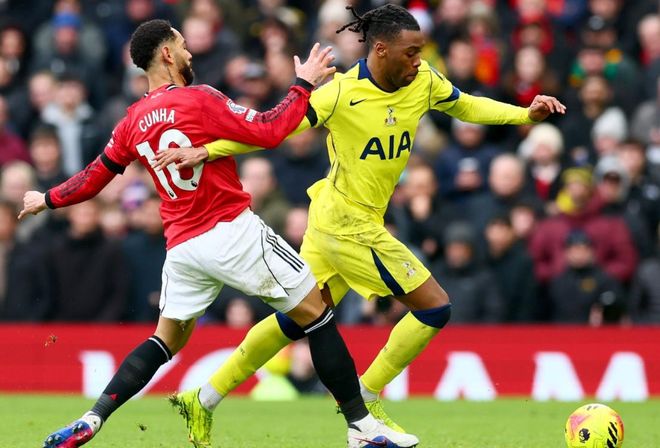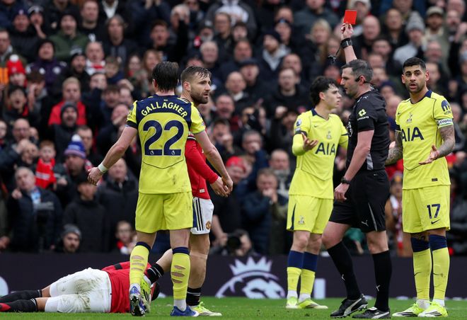 熱刺開局后不久差一點丟球,幸好姆伯莫的勁射踢飛了。擁有主場優(yōu)勢的曼聯(lián)踢得更加有侵略性,庫尼亞和布魯諾-費爾南德斯都獲得非常好的機會,只是他們的射門都踢偏了。羅梅羅犯下致命錯誤,在第29分鐘犯規(guī)被罰下。
