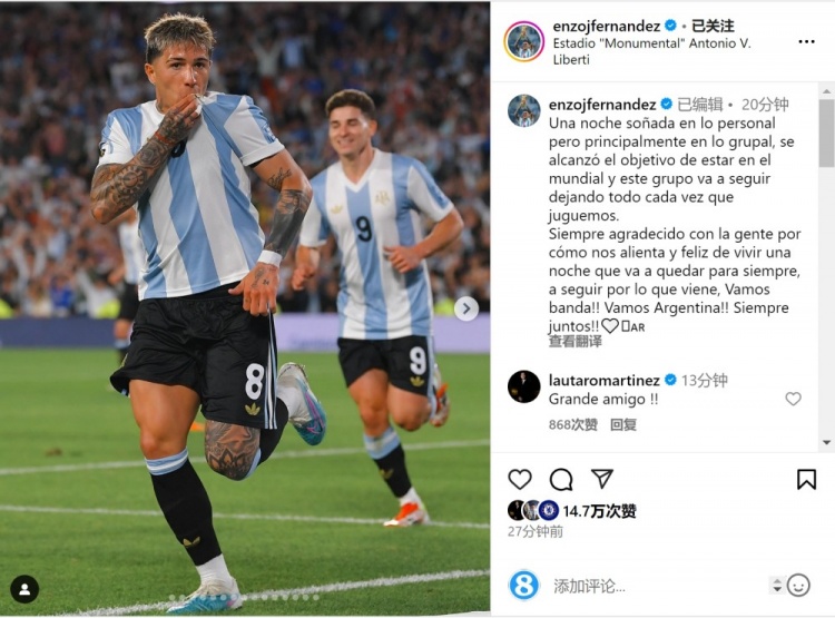 “永遠(yuǎn)感激球迷們對我們的支持,很高興經(jīng)歷一個將被永遠(yuǎn)銘記的夜晚。讓我們?yōu)榻酉聛淼奶魬?zhàn)將繼續(xù)努力!加油,兄弟們!加油,阿根廷!永遠(yuǎn)團(tuán)結(jié)一致!”