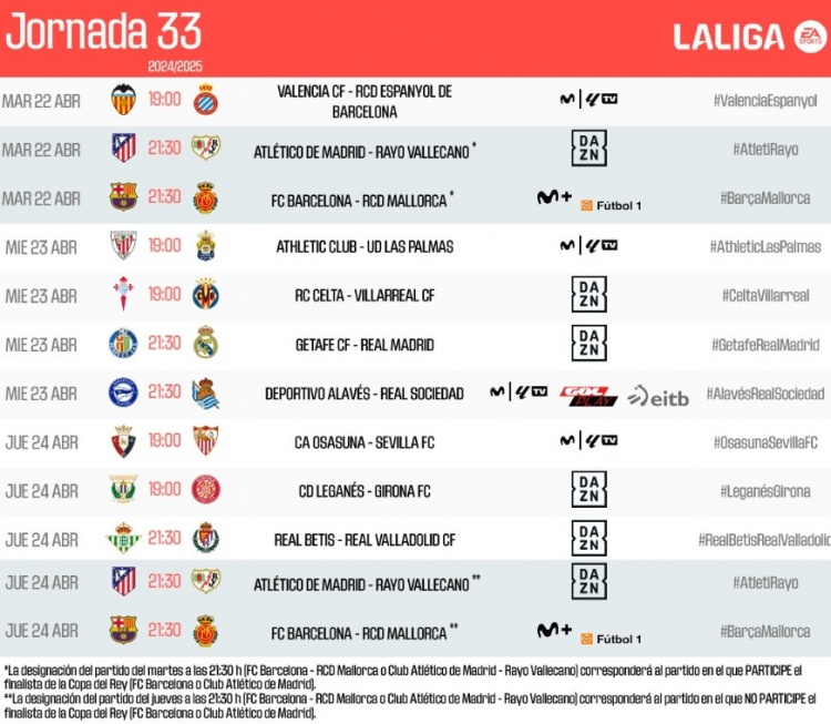 - 西甲第33輪時間:巴薩、馬競的比賽時間視國王杯半決賽結(jié)果而定