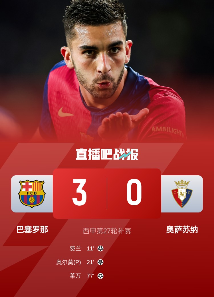 西甲第27輪補(bǔ)賽,巴塞羅那3-0奧薩蘇納,費(fèi)蘭、萊萬(wàn)進(jìn)球,奧爾莫點(diǎn)球+傷退。