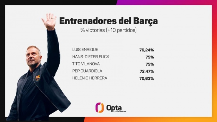 弗里克帶隊巴薩44場取33勝,勝率75%隊史僅次恩里克