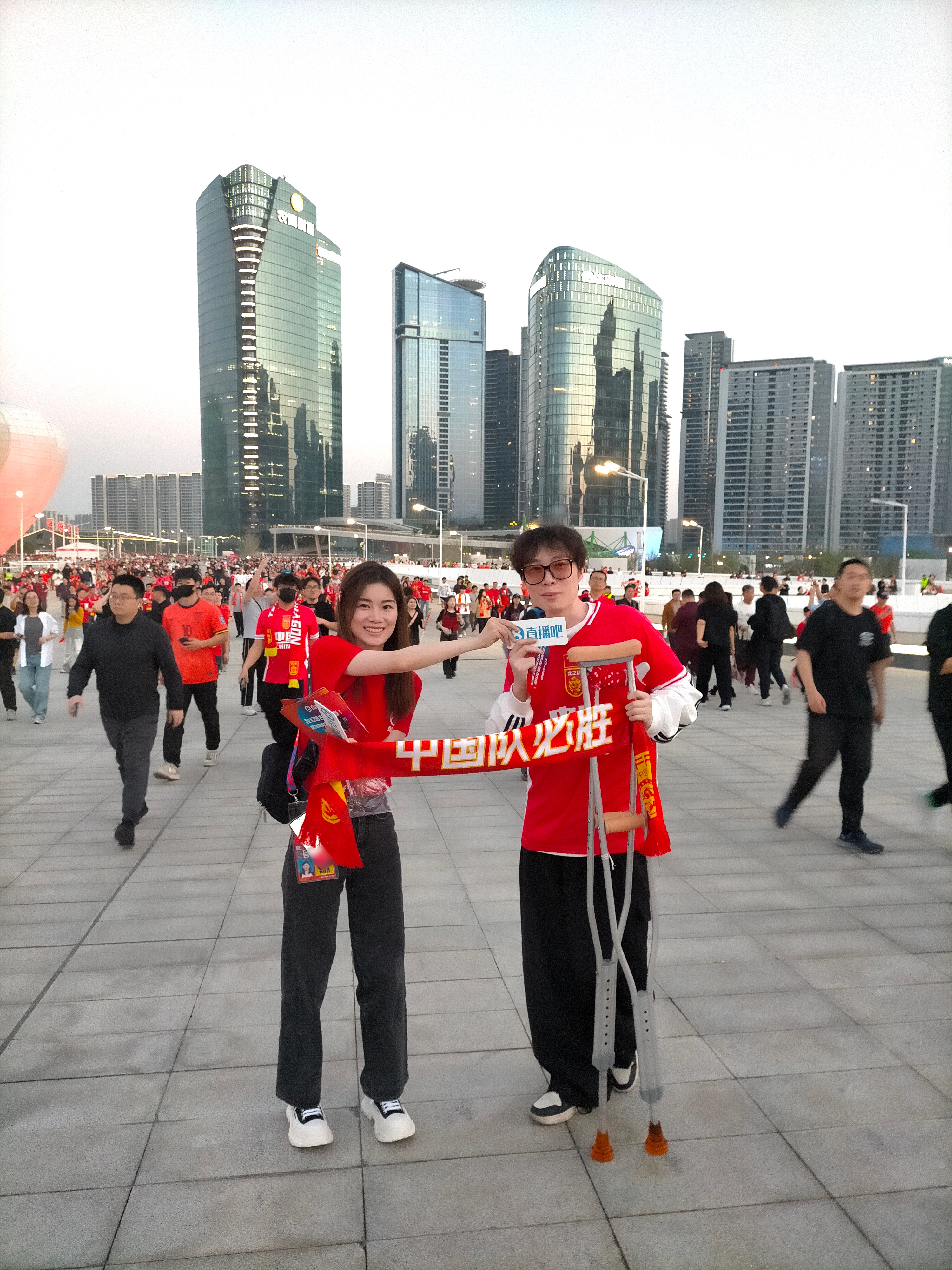 球迷入場前,特邀知名足球解說員劉暢、吳桐現(xiàn)身球場外圍互動區(qū),與候場球迷共同開啟“我們想去美加墨·國足知識大挑戰(zhàn)”主題活動。兩位解說以專業(yè)又不失風趣的風格串聯(lián)答題環(huán)節(jié),現(xiàn)場球迷踴躍參與,爭奪國足助威圍巾等限定周邊?;顒舆^程中,一位從西安乘坐火車輾轉(zhuǎn)20小時,專程來見證這場比賽的12年老吧友坦言:“勝負之外,主隊永遠值得奔赴”。更有廣東韶關(guān)學生球迷不惜暫時放下學業(yè)來杭州觀賽,以自身行動詮釋“00后”對國足的熱忱。