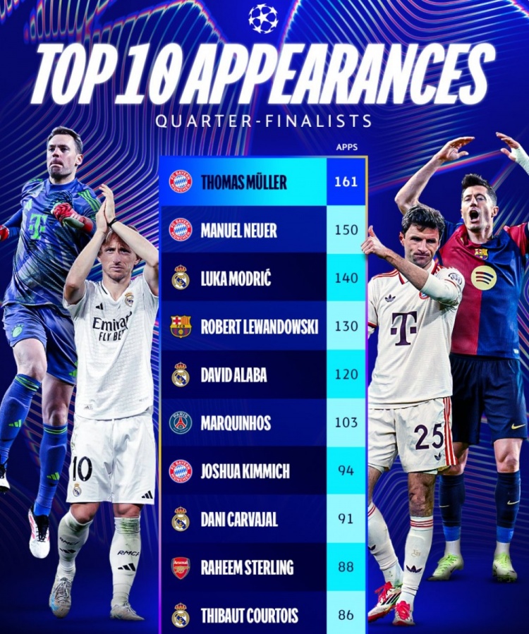 歐冠8強球員賽事出戰(zhàn)場次top10:穆勒161場居首,諾伊爾150場次之