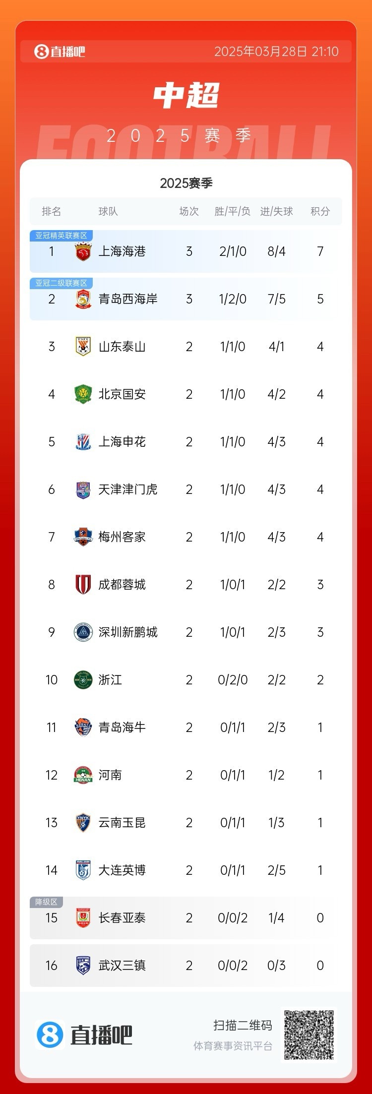 新賽季中超前2輪后,僅有衛(wèi)冕冠軍上海海港保持全勝,他們主場分別3-1擊敗深圳新鵬城、2-0擊敗長春亞泰。