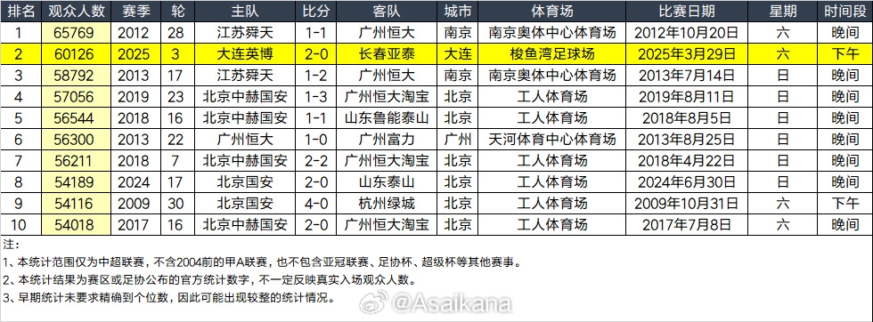 - 大連英博和長(zhǎng)春亞泰吸引60126名觀眾現(xiàn)場(chǎng)觀戰(zhàn),中超歷史排名第二