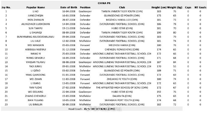 中場:8-劉佳樂(恒大足校)、14-姚俊宇(魯能足校)、19-閆宇喆(華南師范大學附屬中學)、21-張城瑞(大連足協(xié))、22-卞宇郎(上海海港)、23-劉柄麟(恒大足校)