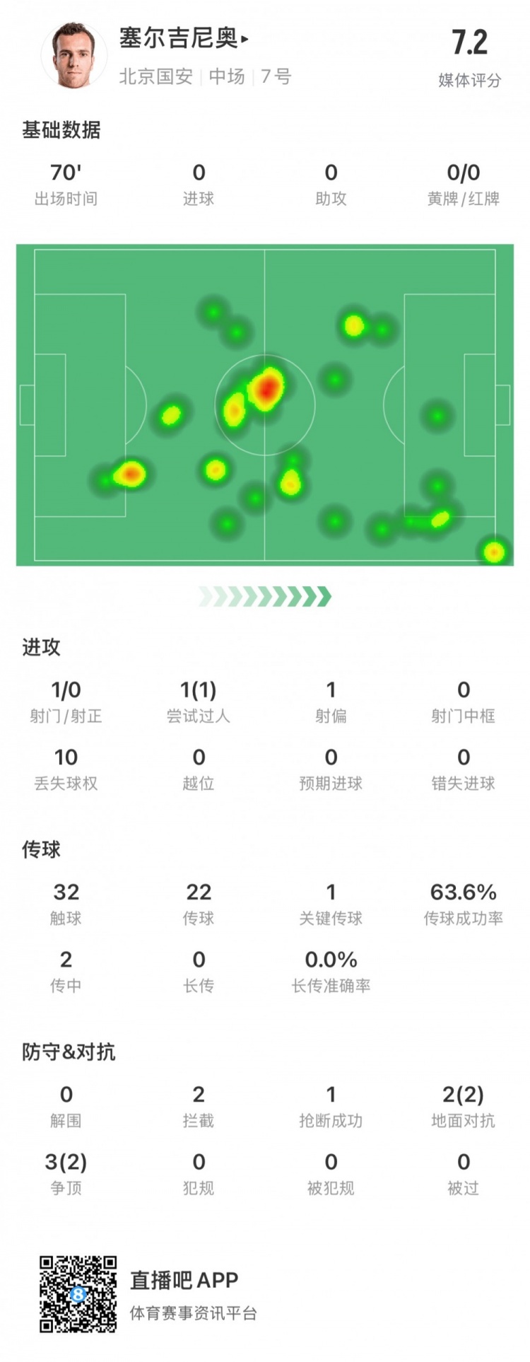 塞爾吉尼奧國(guó)安首秀數(shù)據(jù):出場(chǎng)70分鐘,觸球32次&關(guān)鍵傳球1次