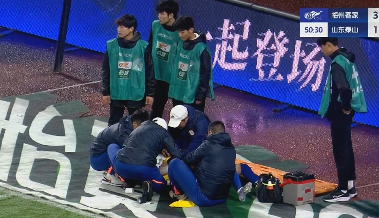 03月29日訊 泰山vs梅州第50分鐘,王彤遠(yuǎn)射后為了躲避封堵失去平衡摔地,隨后被擔(dān)架抬下。張弛替補(bǔ)登場(chǎng)!