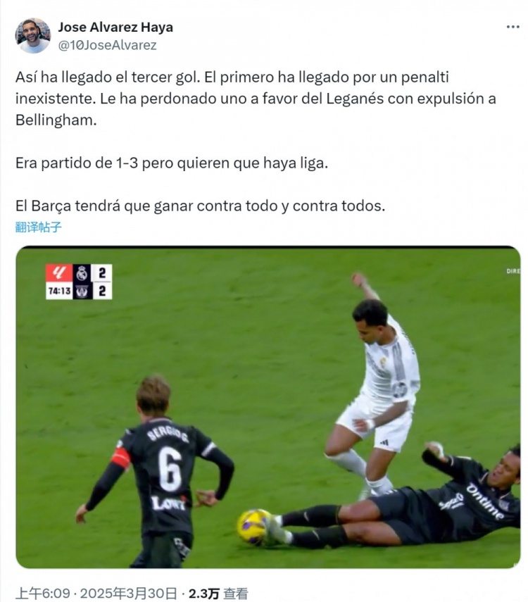 對此西班牙六臺巴薩跟隊記者Jose Alvarez Haya在社交媒體上寫道:“伯納烏的丑聞,判罰了一個不存在的點球(指居勒爾倒地獲點)。”
