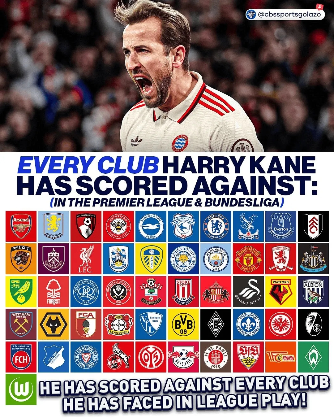 通殺,凱恩德甲、英超對陣51家俱樂部均完成破門