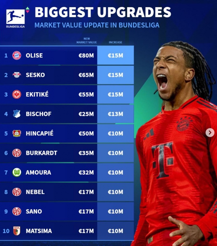 - 德轉(zhuǎn)列身價更新后德甲升值榜:奧利塞&塞斯科&?;倏藵q1500萬歐