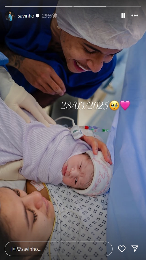 薩維尼奧去年12月宣布女友懷孕,今日他在社交媒體上曬出新生兒的照片,并配上孩子出生的日期——2025年3月28日。