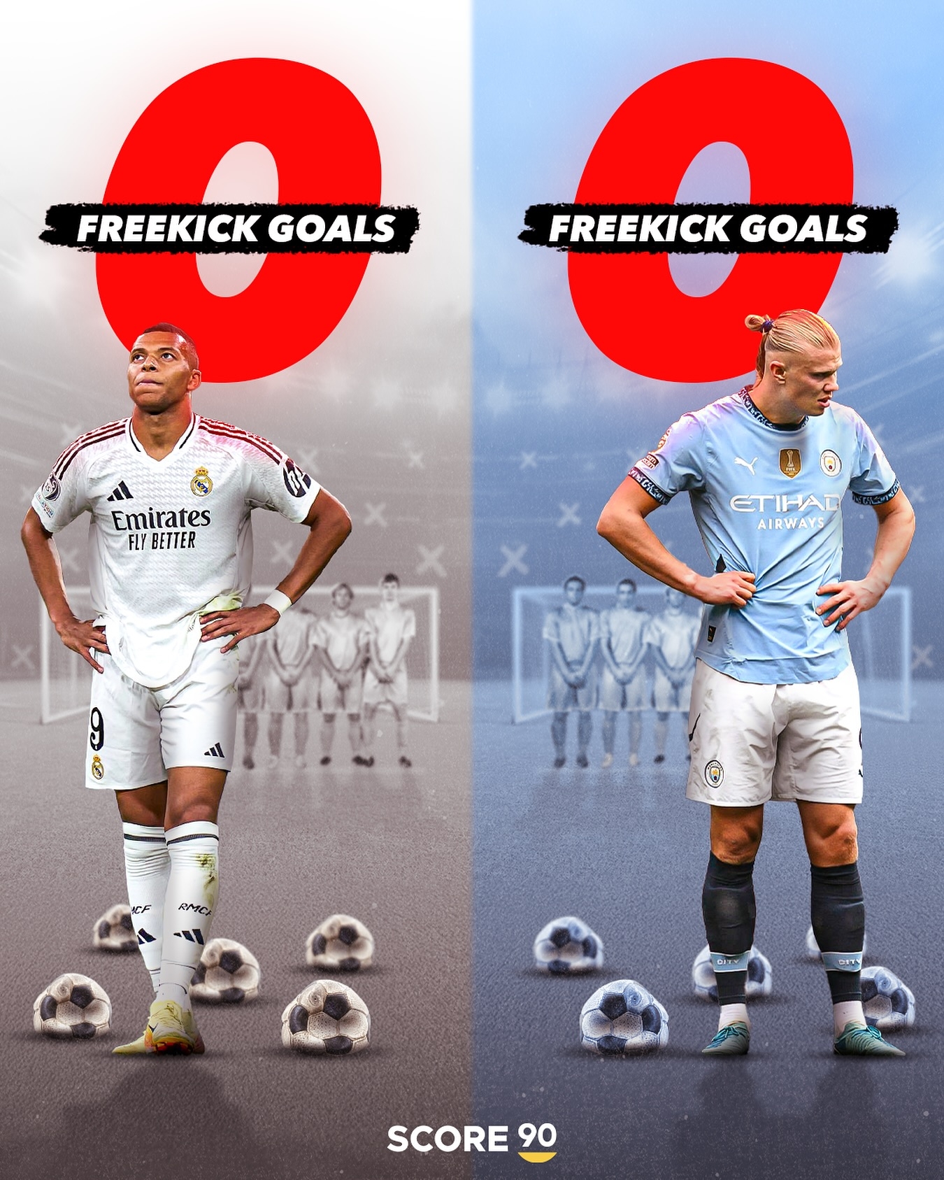 不只是姆巴佩,新雙驕的另一位——哈蘭德,也從未有過任意球破門。