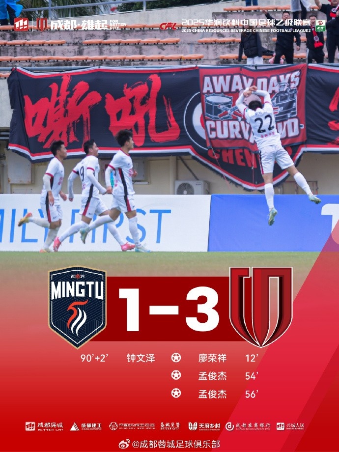 在今天下午進(jìn)行的中乙第2輪成都蓉城B隊與廣東銘途的比賽中,上半場,孟俊杰創(chuàng)造點球機(jī)會,廖榮祥點射破門;下半場,孟俊杰3分鐘內(nèi)梅開二度,廣東銘途補(bǔ)時階段扳回一球。最終,成都蓉城B隊3-1擊敗對手,收獲兩連勝。