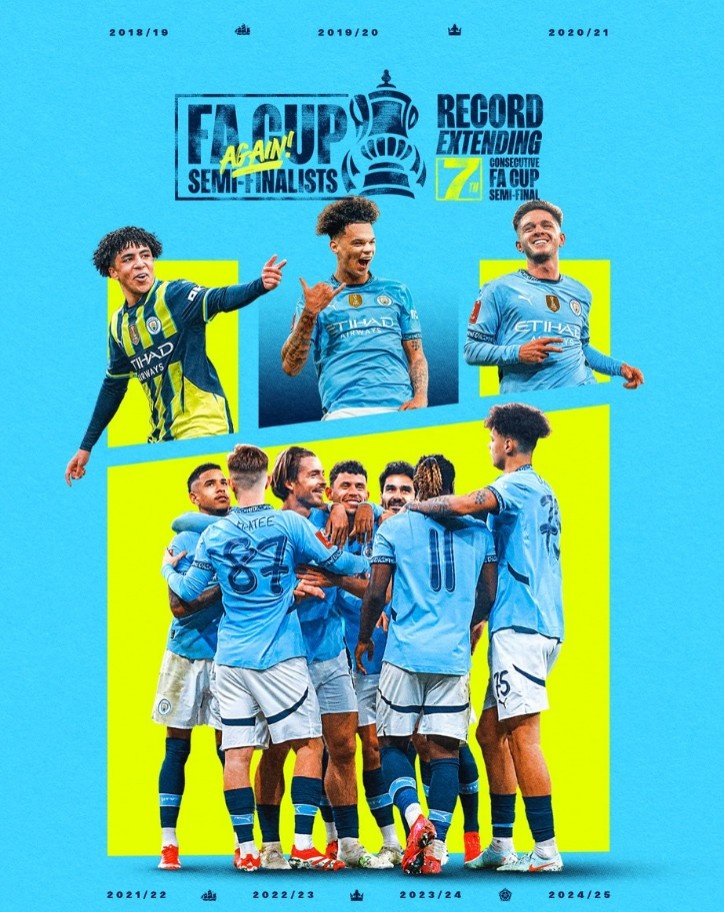 - 曼城連續(xù)7年晉級足總杯半決賽,創(chuàng)賽事歷史紀錄