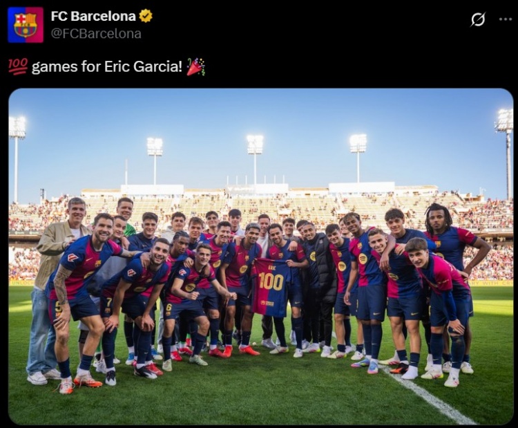 本場比賽埃里克-加西亞首發(fā)登場,這是他加盟巴薩以來各項(xiàng)賽事第100次出場,賽后他也獲贈球隊(duì)100號定制球衣,并與全隊(duì)球員合影留念。