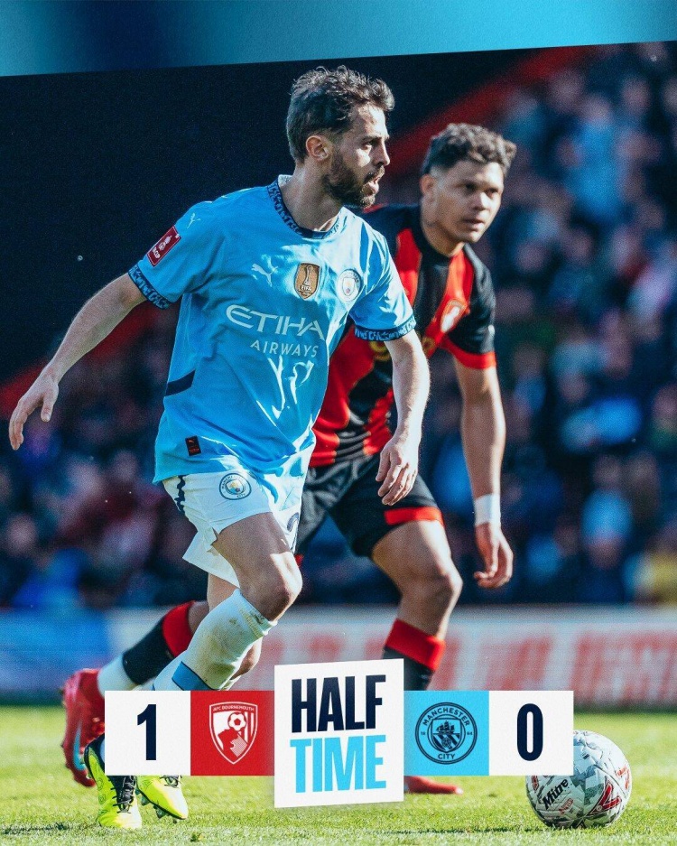 上半場(chǎng)傷停補(bǔ)時(shí)1分鐘,半場(chǎng)結(jié)束,伯恩茅斯暫1-0曼城。