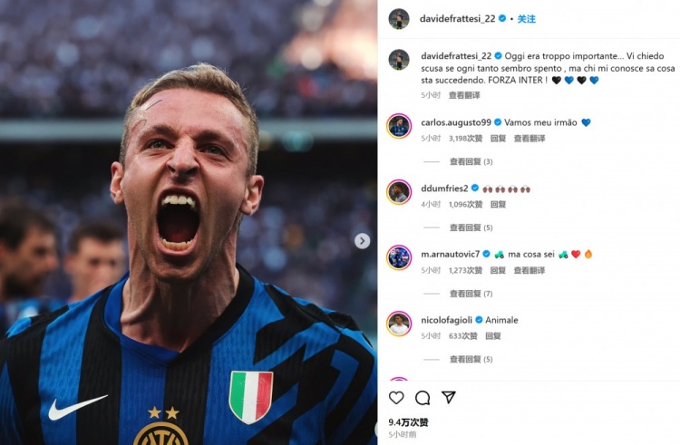 弗拉泰西也在賽后通過社媒曬出自己的怒吼慶祝照,并配文:“今天(的勝利)太重要了……如果我有時踢得不太好,我對此非常抱歉。但那些了解我的人都清楚發(fā)生了什么。加油,國際米蘭!”