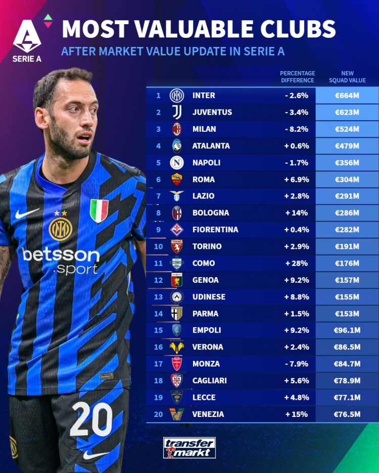 意甲球隊(duì)德轉(zhuǎn)身價(jià)排名(括號(hào)內(nèi)為變動(dòng)幅度)