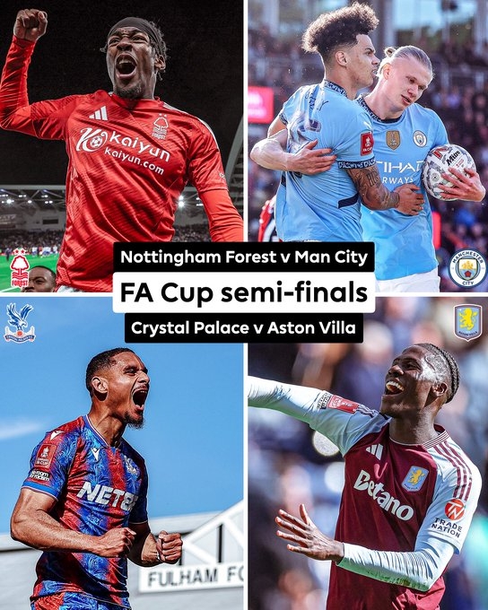足總杯4強(qiáng)對陣:曼城vs諾丁漢森林,水晶宮vs維拉。