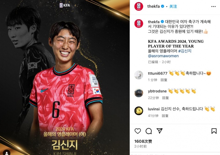 - 官方:34歲韓國女足名將池笑然當(dāng)選韓足協(xié)2024年度最佳女足球員