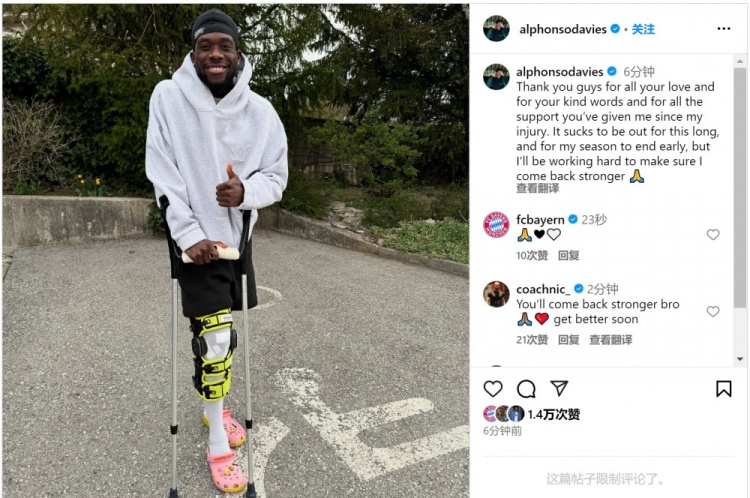 3月31日訊 拜仁后衛(wèi)戴維斯更新社媒動態(tài),感謝球迷對他的支持和祝福,并確認賽季報銷。